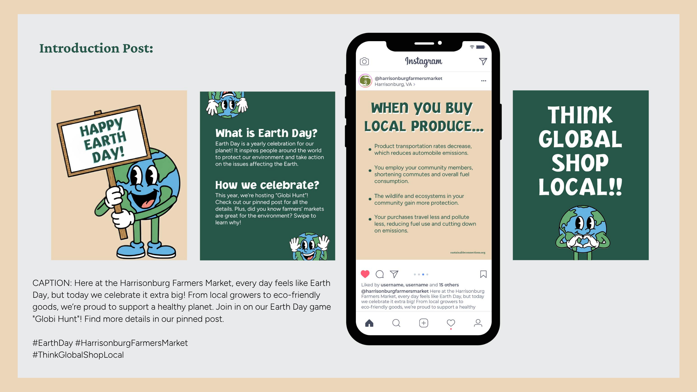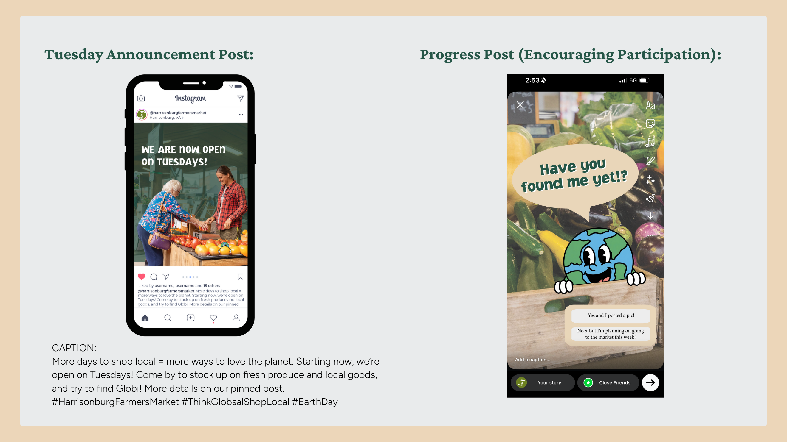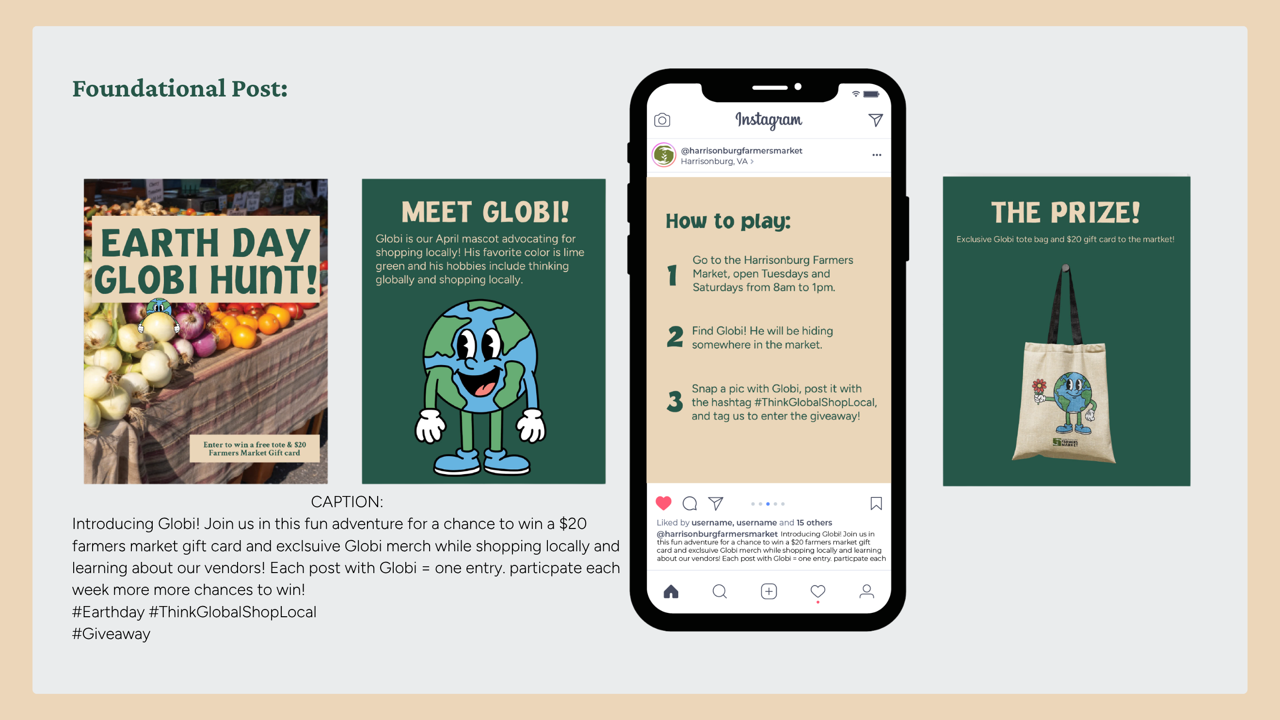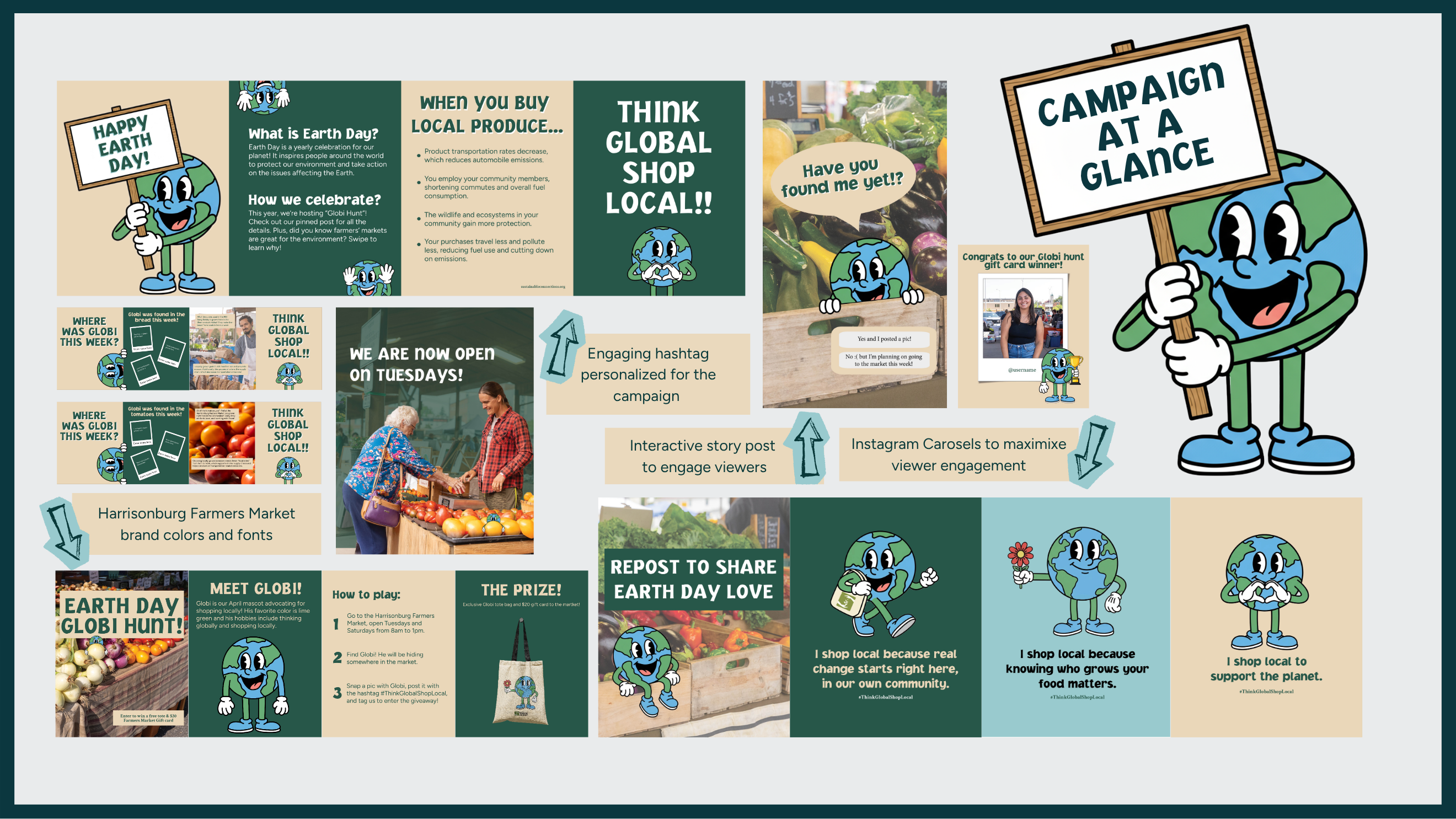 Our approach focused on meeting the Harrisonburg Farmers’ Market audience where they already were both physically at the market and digitally on social media. Research showed that the market’s audience is predominantly female, highly active online, and more likely to attend events that offer interactive or hands-on experiences. Building on these insights, we created Globi Hunt: a lighthearted, scavenger-hunt-style activity centered around Globi, a friendly Earth-inspired character. By using the market’s existing color palette and brand identity, we ensured instant recognition and consistency, while Globi added warmth, personality, and approachability. The campaign blended physical touchpoints with digital promotion to create a cohesive, integrated experience throughout the month of April.