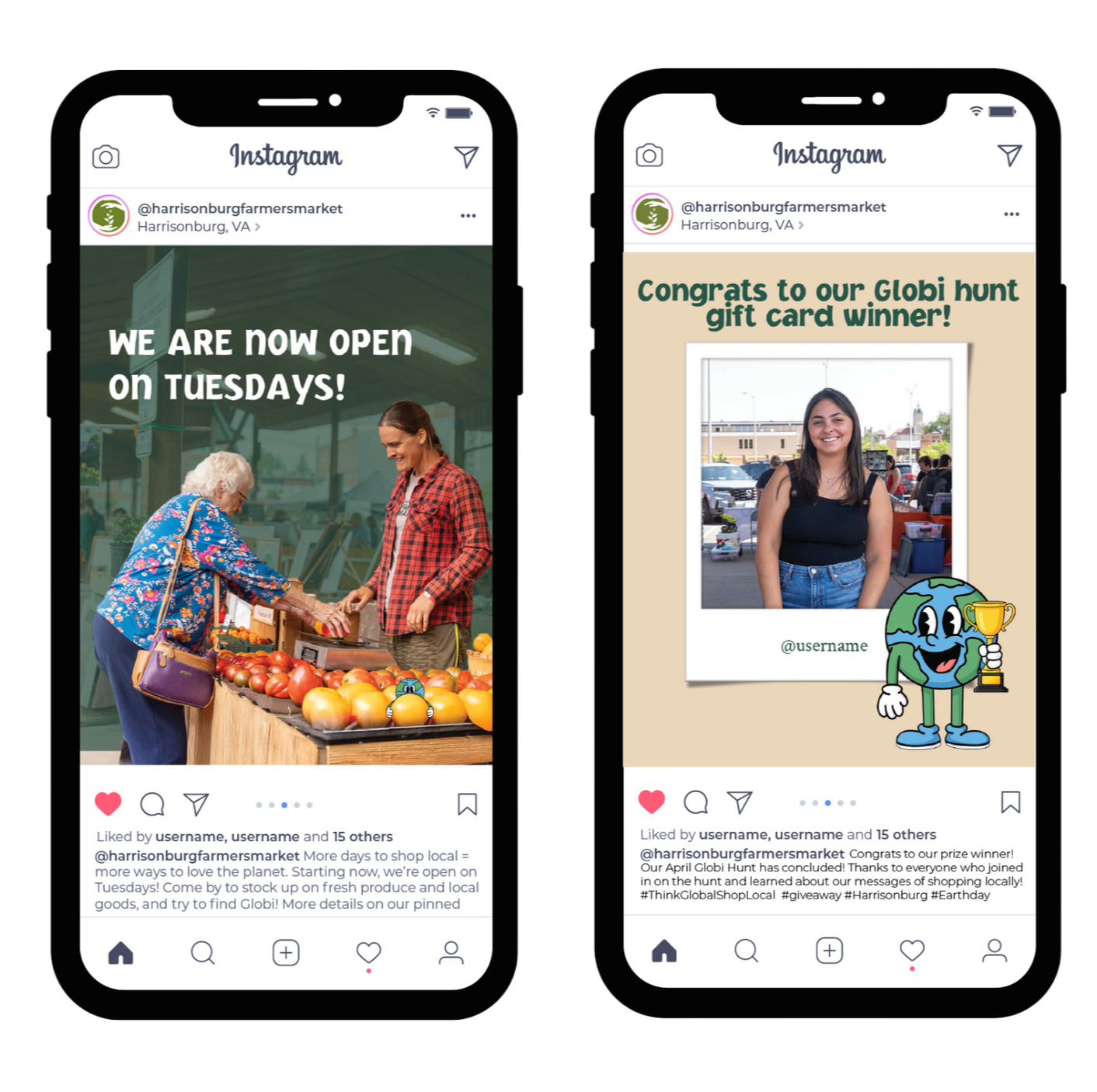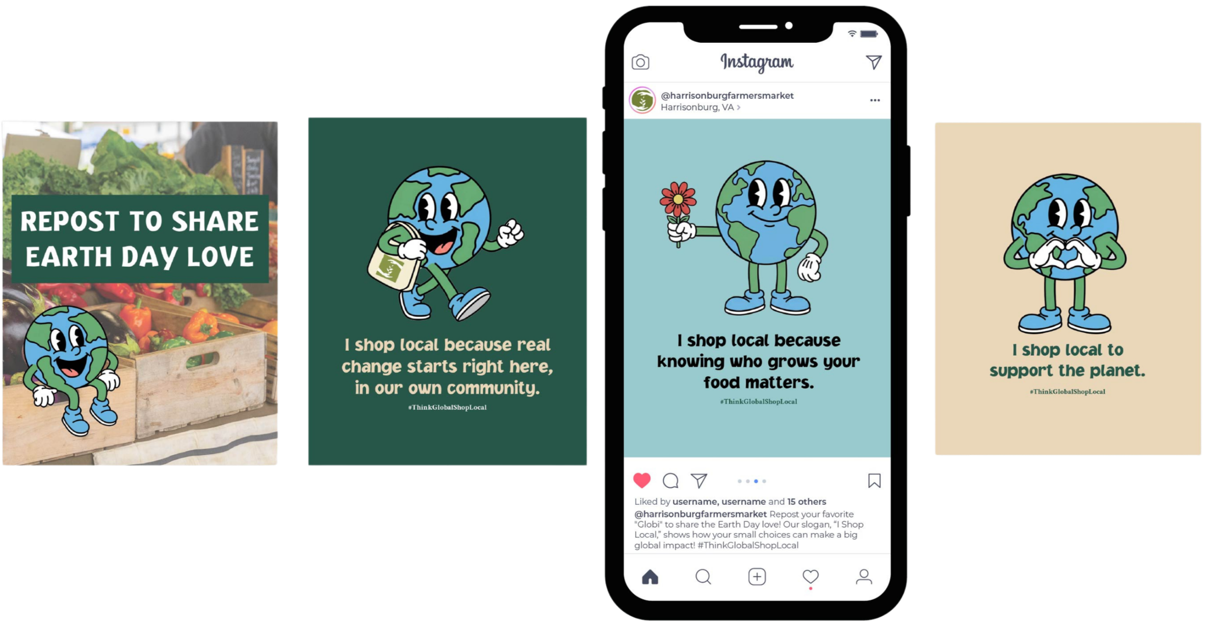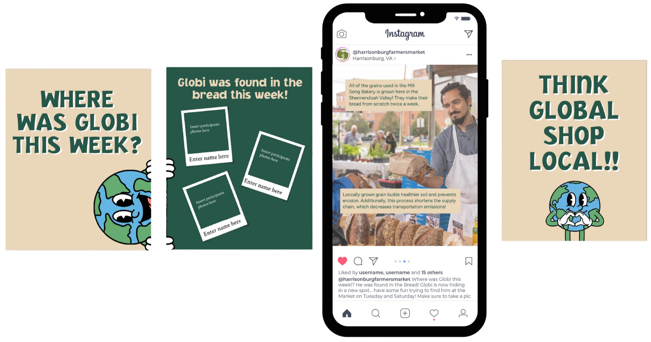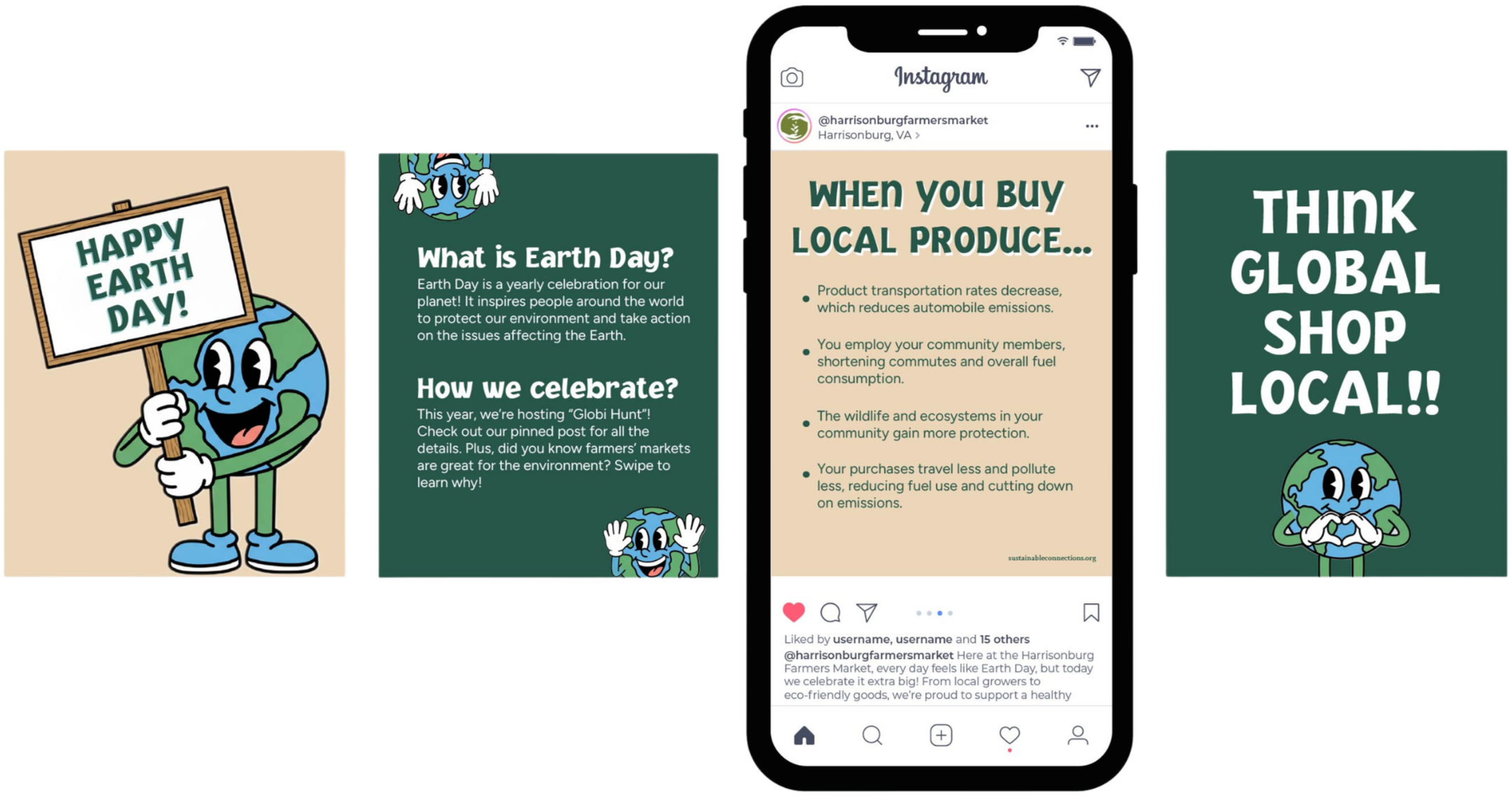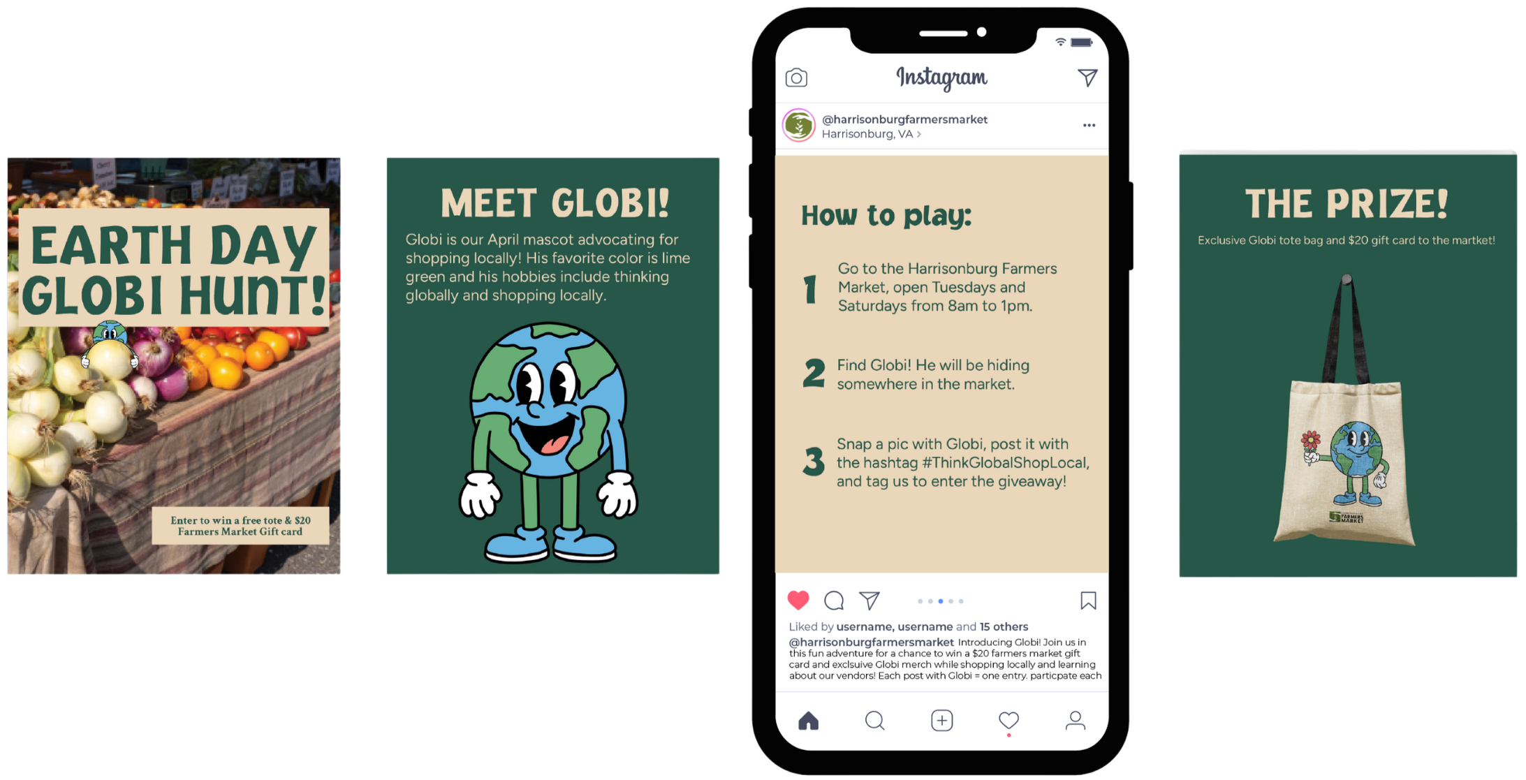 This project reimagines how Harrisonburg locals engage with Earth Day by transforming a traditional awareness moment into an interactive, in-person experience at the Harrisonburg Farmers’ Market. Through “Globi Hunt,” a scavenger-hunt-style campaign, the project encouraged visitors to explore the market, engage with vendors, and celebrate sustainability in a way that felt accessible, fun, and community-oriented.