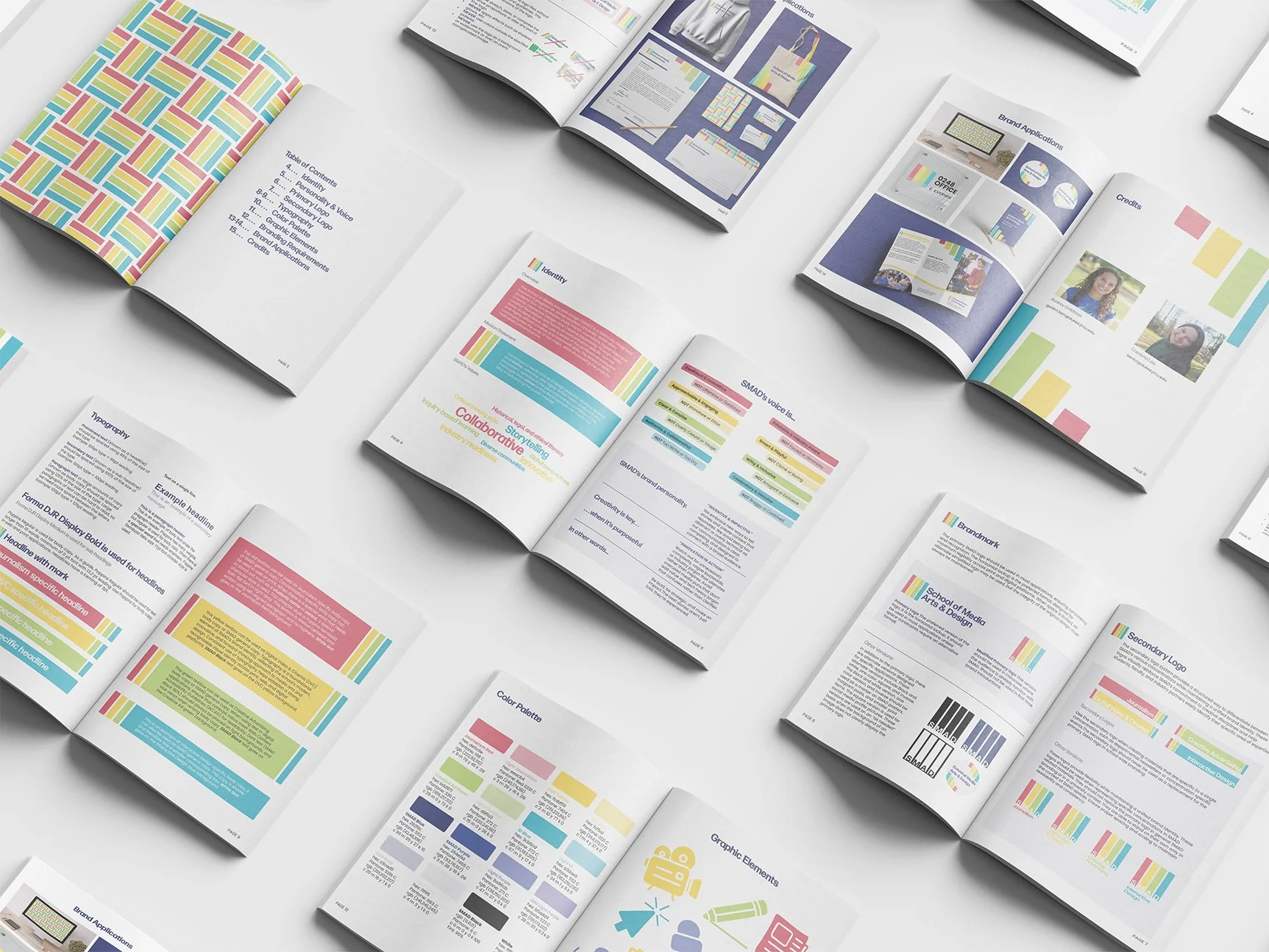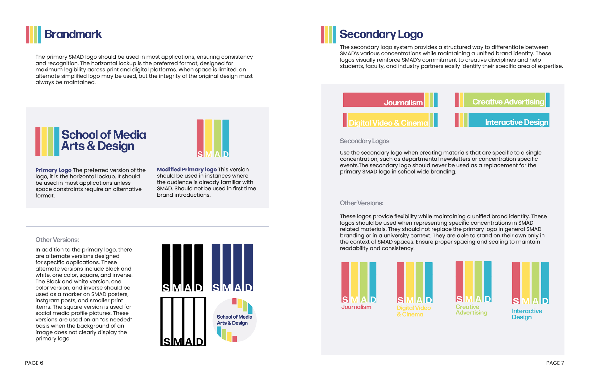 This project redefines the visual identity of the School of Media Arts & Design (SMAD) through a refreshed logo and a cohesive brand guide. The redesign brings clarity, energy, and unity to the program’s branding, helping students, faculty, and external audiences better understand SMAD as a dynamic hub for media storytelling across four distinct concentrations. The final system balances creativity with structure, ensuring flexibility while maintaining consistency.